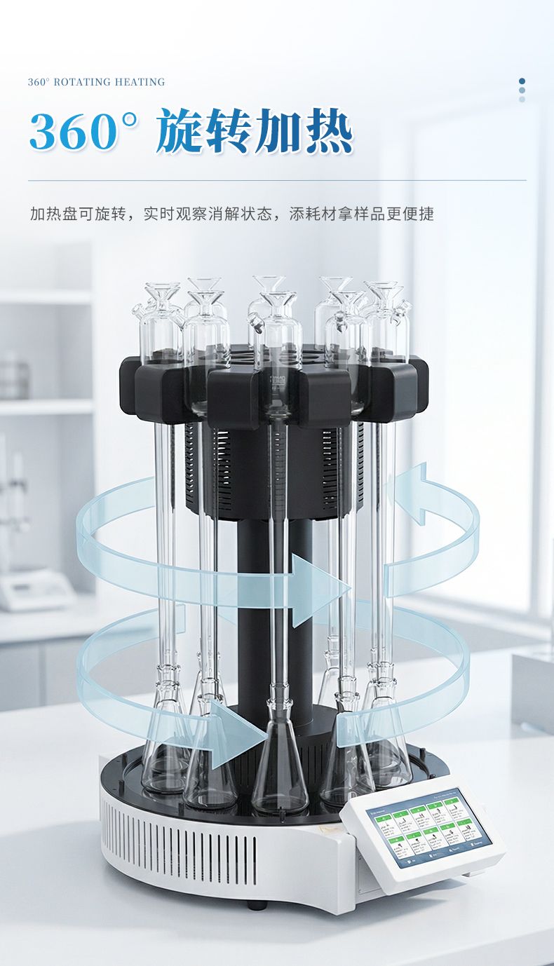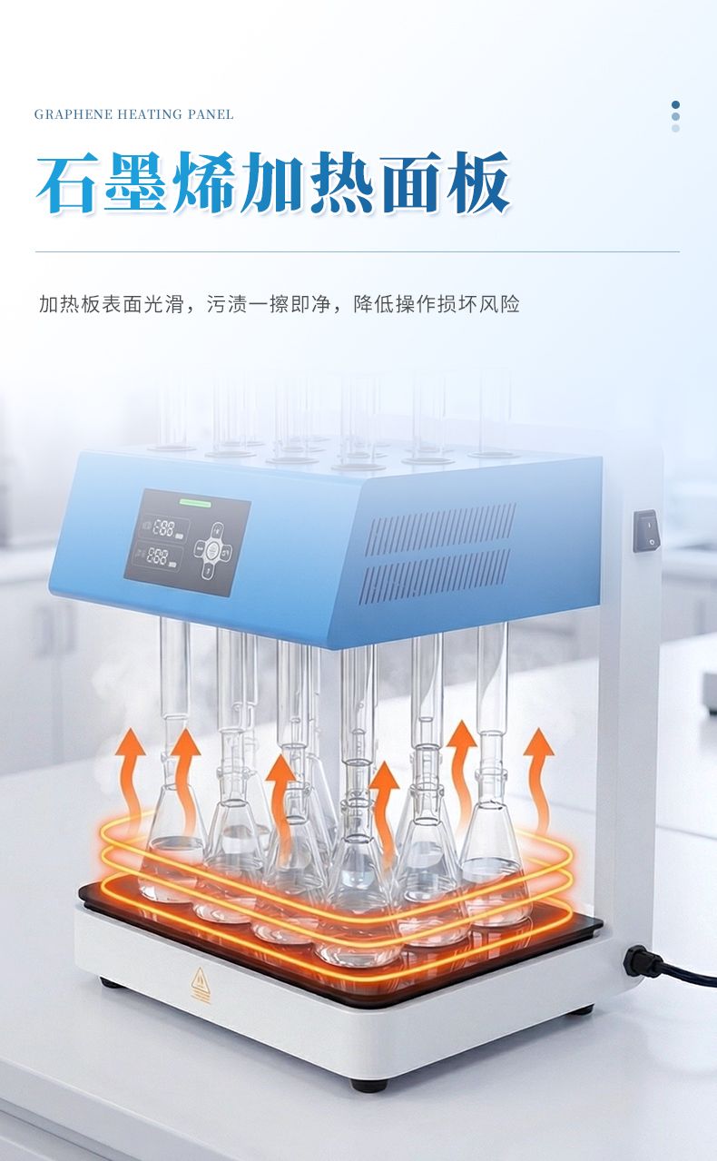 3. 安全性能優:采用玻璃毛刺回流管代替球形回流管,并以風冷+水冷技術取代傳統自來水冷卻方式,既可以節水又能使儀器規范化,同時具備過熱斷電等功能,提高了儀器使用的安全性。 4.面板易清潔:采用石墨烯加熱板,表面光滑、平整,表面污漬一擦即凈,可減少操作不當對儀器的損壞;