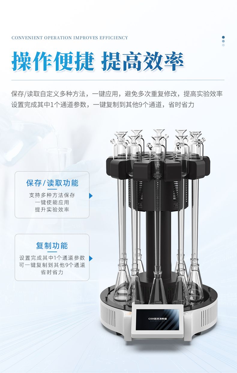 化學需氧量(COD)智能回流消解器遵循了國家標準《HJ828-2017 水質 化學需氧量的測定 重鉻酸鹽法》的基本原則,保證了回流加熱微沸2小時的消解操作,試劑溶液的配制和加入量與國標法一致,確保可靠準確的分析結果。