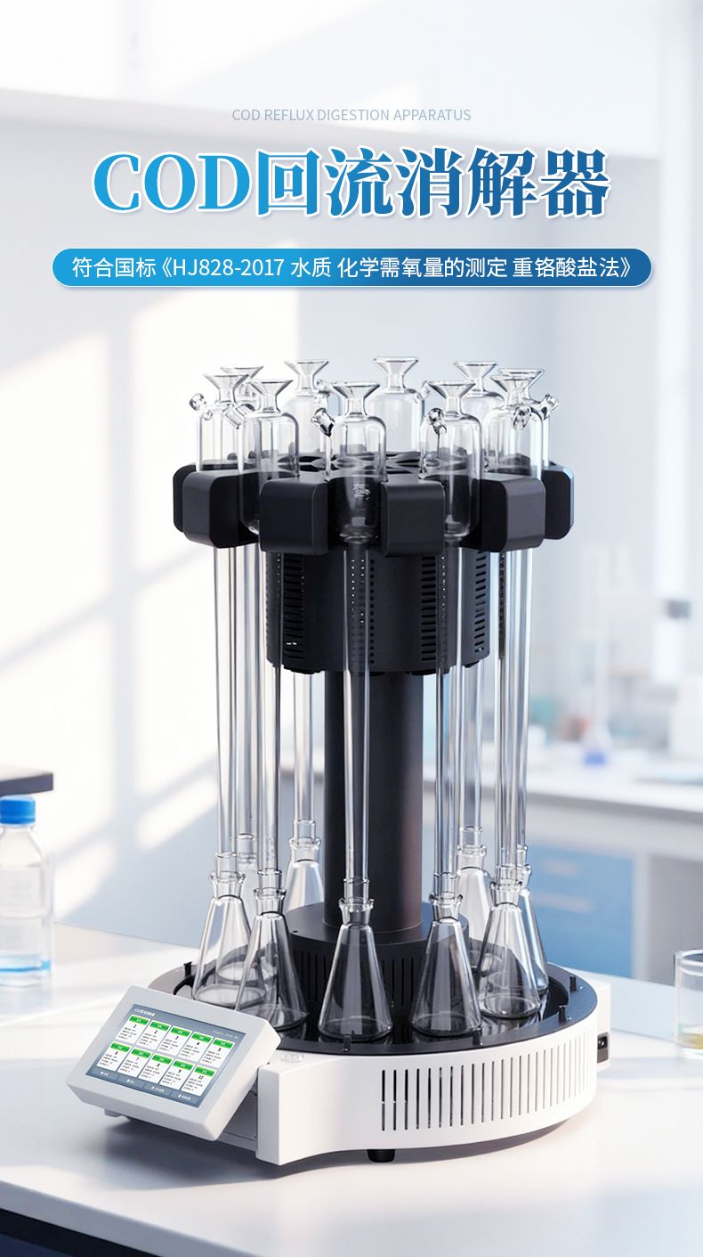 化學需氧量(COD)智能回流消解器遵循了國家標準《HJ828-2017 水質 化學需氧量的測定 重鉻酸鹽法》的基本原則,保證了回流加熱微沸2小時的消解操作,試劑溶液的配制和加入量與國標法一致,確保可靠準確的分析結果。