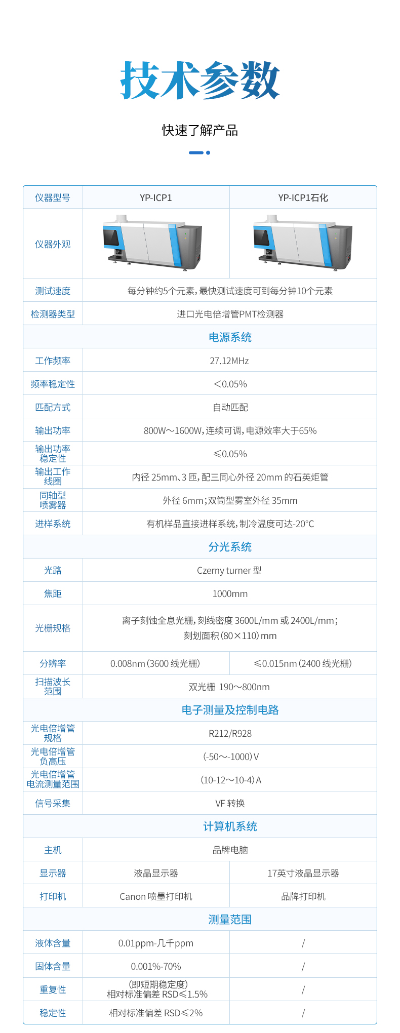 全譜直讀型電感耦合等離子體發射光譜儀 ,是目前無機元素分析的主流產品,它具有光譜干擾小,穩定性好、分析快速等優點,是無機元素分析領域常用的手段。可廣泛應用于環境保護、食品安全、地質礦產、冶金、有色金屬、稀土、化工、臨床醫藥、石油制品、半導體、農業研究等各個領域。用于測定不同物質中的常量、微量、痕量元素含量,可用于樣品中元素的定性、半定量及精確定量分析,檢出限可達十億分之一級。