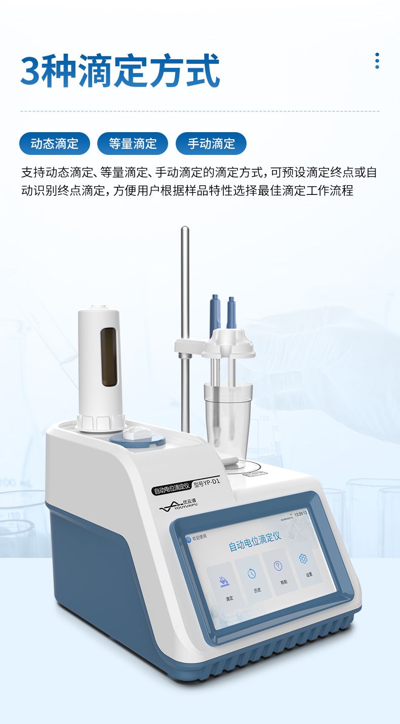 自動(dòng)電位滴定儀是一種用于化學(xué)分析的精密儀器,他通過(guò)自動(dòng)添加滴定劑來(lái)確定樣品中特定成分的濃度。該儀器基于電位滴定原理工作,即根據(jù)在滴定過(guò)程中電池電動(dòng)勢(shì)的變化來(lái)確定滴定終點(diǎn)的一款滴定設(shè)備。設(shè)備滿足國(guó)家檢定規(guī)程JJG 814-2015《自動(dòng)電位滴定儀》儀器級(jí)別中的0.05級(jí)別,即儀器最大示值誤差為±1.5%,儀器示值重復(fù)性≤0.2%