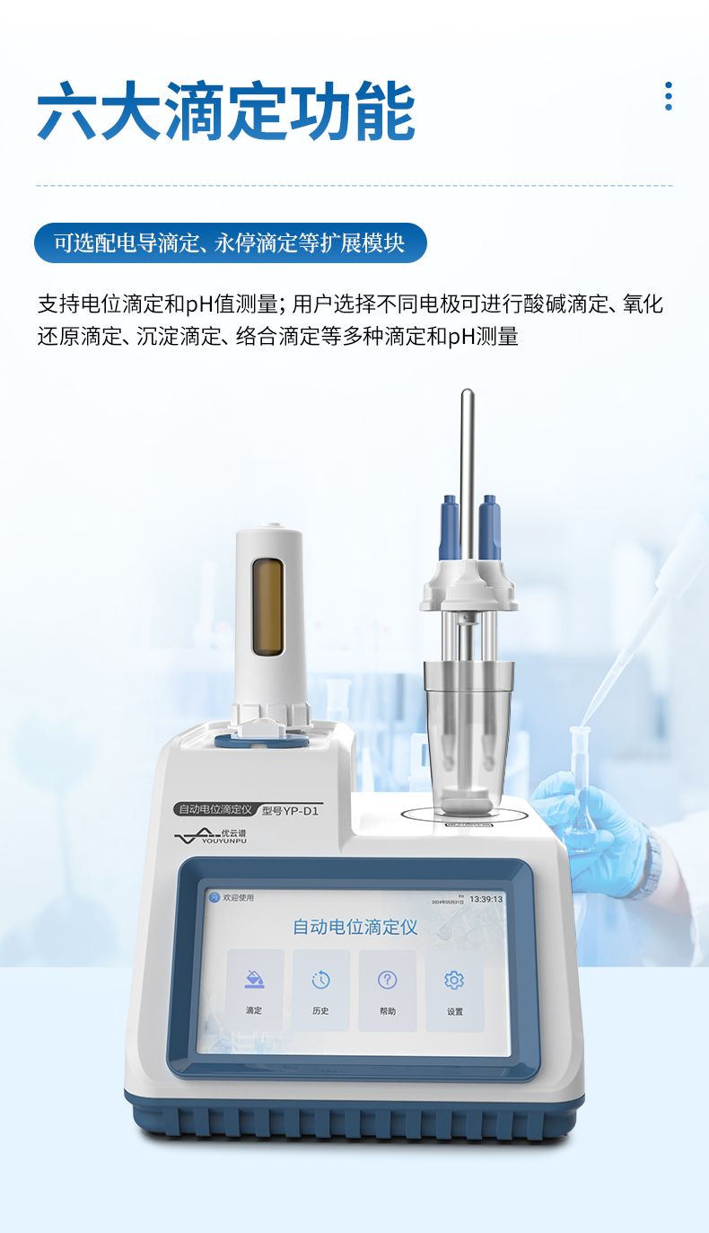 自動電位滴定儀是一種用于化學(xué)分析的精密儀器,他通過自動添加滴定劑來確定樣品中特定成分的濃度。該儀器基于電位滴定原理工作,即根據(jù)在滴定過程中電池電動勢的變化來確定滴定終點(diǎn)的一款滴定設(shè)備。設(shè)備滿足國家檢定規(guī)程JJG 814-2015《自動電位滴定儀》儀器級別中的0.05級別,即儀器最大示值誤差為±1.5%,儀器示值重復(fù)性≤0.2%