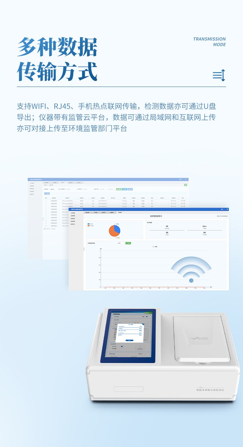 6、具有無線通訊功能,支持WIFI、RJ45、手機熱點聯網傳輸,檢測數據亦可通過U盤導出;