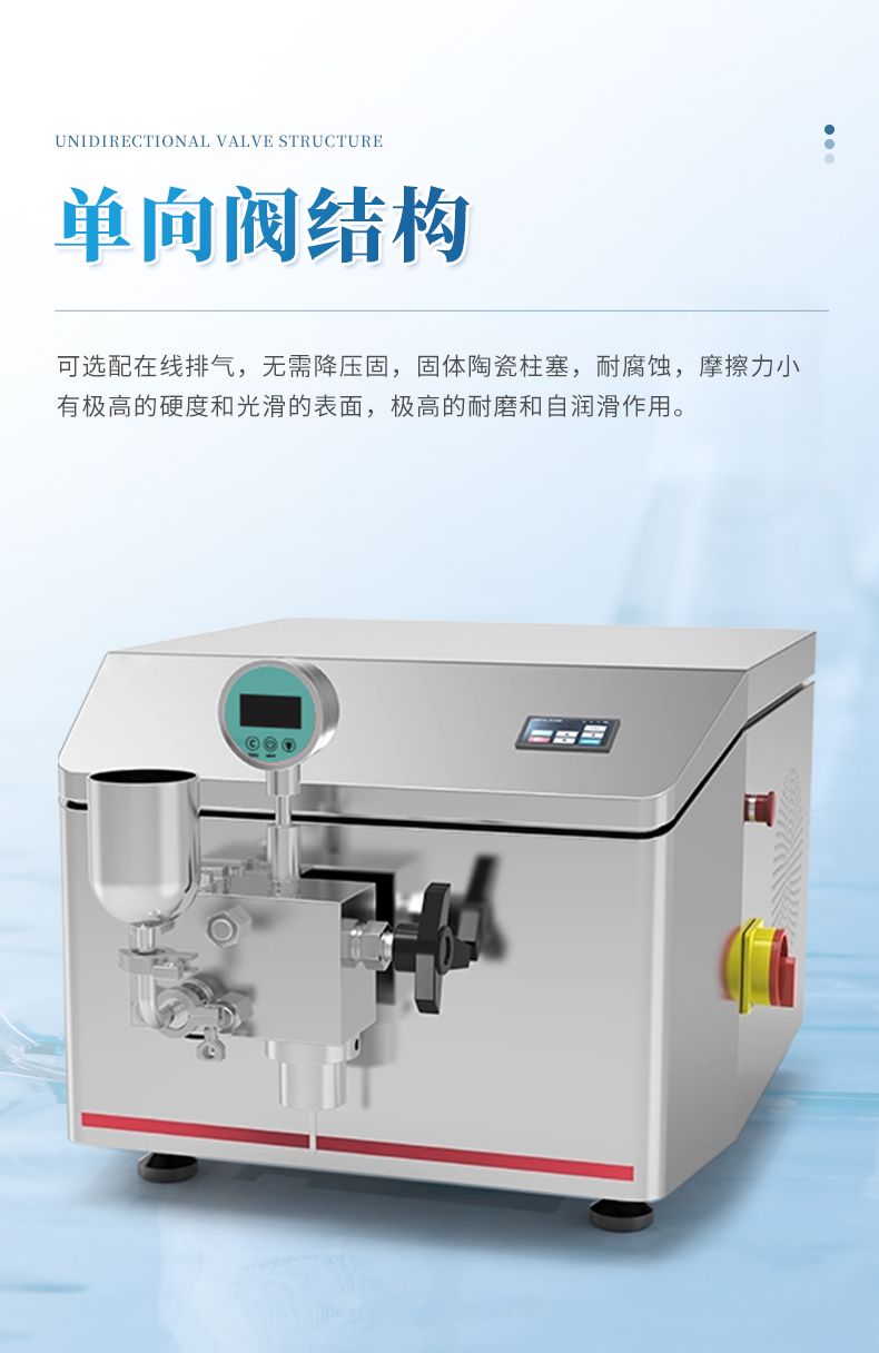 6、物料控溫:要求均質(zhì)閥帶控溫夾套與控溫介質(zhì)出入接頭、連接管路,可實現(xiàn)在線控溫。低溫時,出料溫度可控制在4℃左右,保證物料生物學(xué)活性。