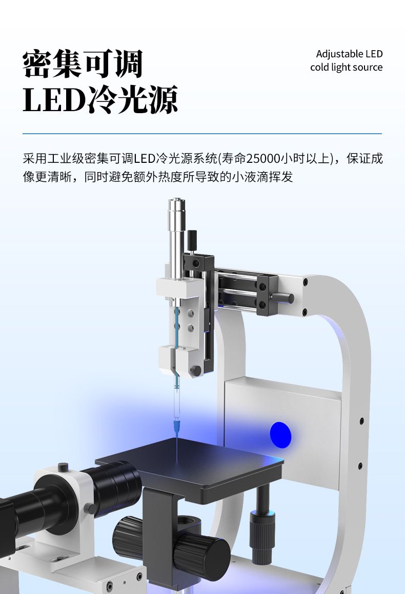 2. 采用工業(yè)級(jí)密集可調(diào)LED冷光源系統(tǒng)(壽命25000H以上),保證成像更清晰,同時(shí)避免額外熱度所導(dǎo)致的小液滴揮發(fā);
