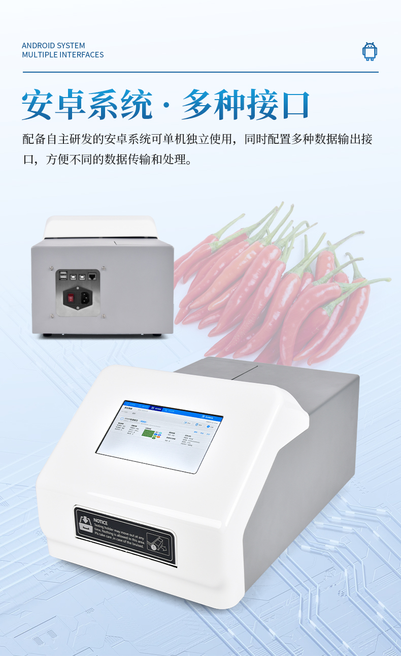辣椒素檢測儀主要用于各種辣椒及辣椒制品中的天然辣椒素、辣度檢測。儀器由亮度發光二管光源、比色池、高靈敏度集成光電池、微處理器、漢字大屏幕液晶屏、嵌入式微型熱敏打印機集成芯片構成,可直接在大屏幕液晶屏上顯示出被測樣品中相關指標的含量,并打印出分析結果,還可以通過計算機接口將數據傳輸到電腦進行數據分析。