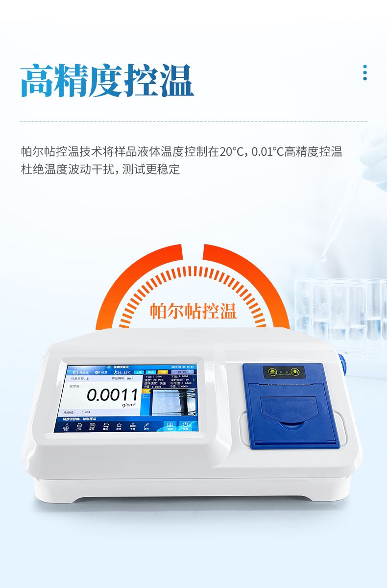 恒溫電子式液體密度計(jì)是通過(guò)結(jié)合帕爾帖控溫技術(shù)將樣品液體溫度控制在20℃,再由電磁引發(fā)U型管震蕩,通過(guò)震蕩頻率測(cè)算出樣品液體的密度。能夠測(cè)試大部分液體(高粘度以及氟化氫等會(huì)腐蝕玻璃的除外),正以實(shí)用、可靠、準(zhǔn)確率高、測(cè)量精度高等優(yōu)點(diǎn),廣泛應(yīng)用于飲料食品、石油化工、檢驗(yàn)檢疫、計(jì)量校準(zhǔn)等分析領(lǐng)域里。