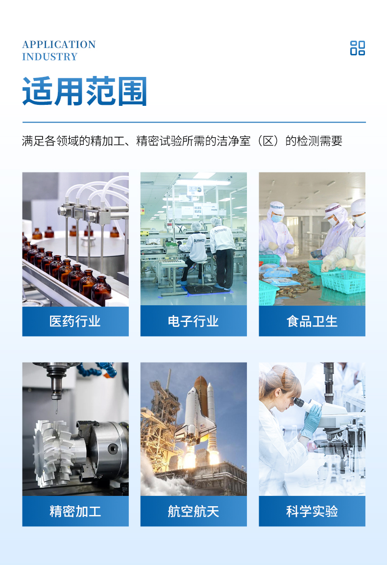 滿足醫(yī)藥行業(yè)(制藥廠、藥檢所、醫(yī)院等);電子行業(yè)(半導(dǎo)體工廠、精密機(jī)械的生產(chǎn)加工等);食品衛(wèi)生行業(yè)(乳制品、塑封肉食品、調(diào)味食品、農(nóng)產(chǎn)品等的精加工);過濾器的生產(chǎn)廠家(檢驗過濾器的質(zhì)量及效率等);光學(xué)及航空航天等領(lǐng)域的精加工、精密試驗、生物工程等所需的潔凈室(區(qū))的檢測需要。