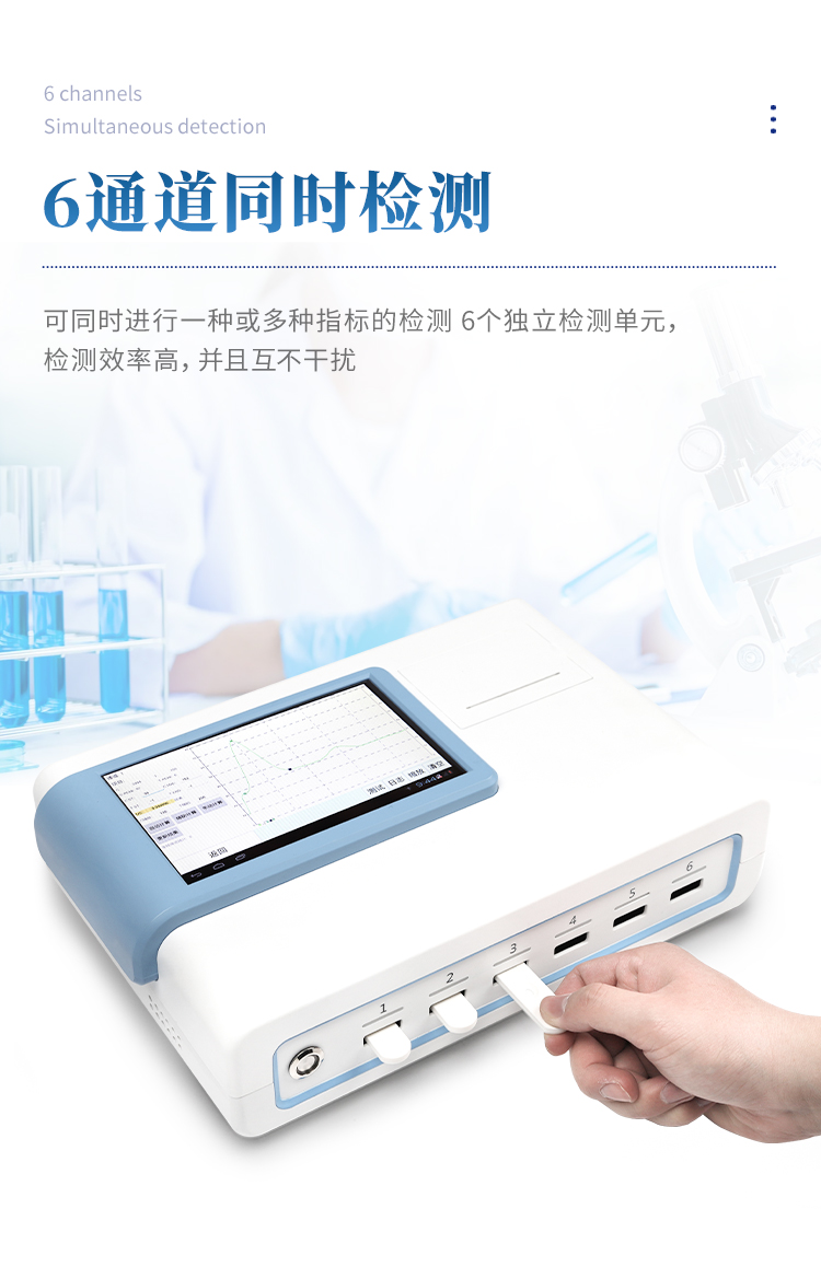 5、6通道設計,可同時進行一種或多種指標的檢測,6個獨立檢測單元,檢測效率高,并且互不干擾;