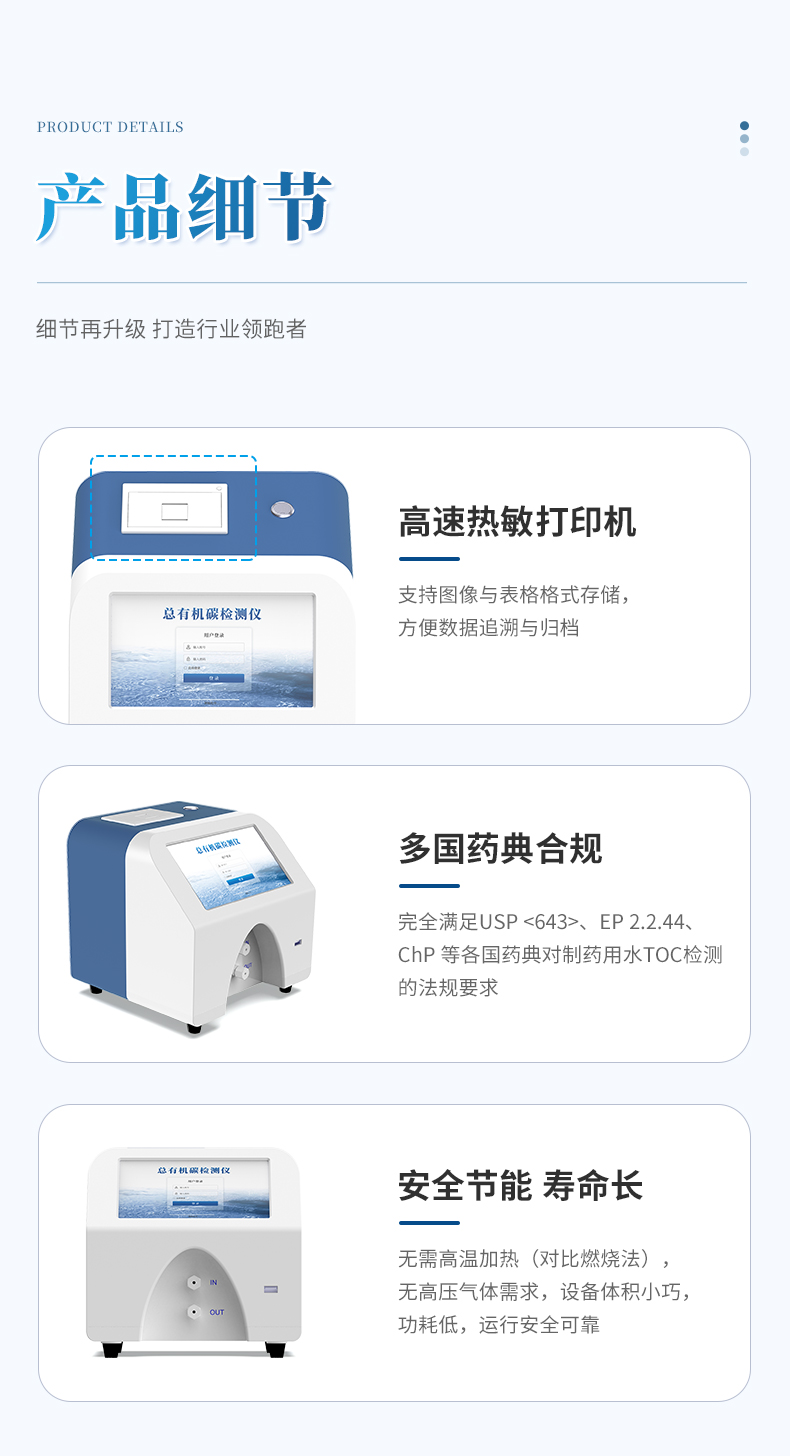 1、檢測(cè)制藥工業(yè)中純化水、注射用水和高純水中總有機(jī)碳的濃度;