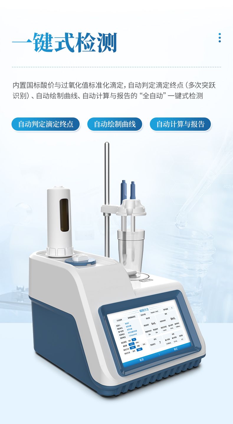 3.內(nèi)置國標(biāo)酸價(jià)與過氧化值標(biāo)準(zhǔn)化滴定,自動(dòng)判定滴定終點(diǎn)(多次突躍識(shí)別)、自動(dòng)繪制曲線、自動(dòng)計(jì)算與報(bào)告的“全自動(dòng)”一鍵式檢測(cè);