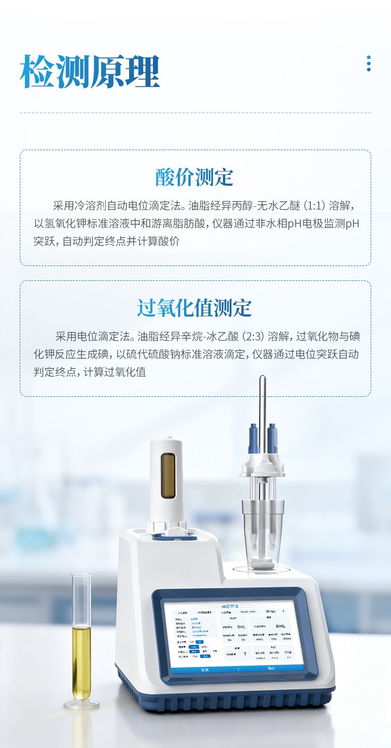 過氧化值測(cè)定:采用電位滴定法。油脂經(jīng)異辛烷-冰乙酸(2:3)溶解,過氧化物與碘化鉀反應(yīng)生成碘,以硫代硫酸鈉標(biāo)準(zhǔn)溶液滴定,儀器通過電位突躍自動(dòng)判定終點(diǎn),計(jì)算過氧化值。