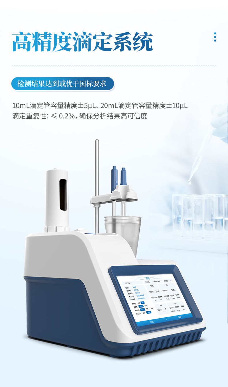 2.高精度滴定系統(tǒng),檢測(cè)結(jié)果達(dá)到或優(yōu)于國標(biāo)要求。支持滴定管快速更換,維護(hù)便捷;