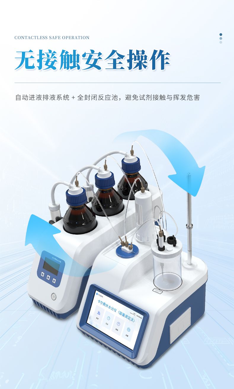3.儀器采用全密封滴定池瓶,避免試劑與人接觸,杜絕環境濕度對檢測的影響;檢測過程中儀器自動控制,攪拌、測定60秒左右完成,可直接顯示測定結果,無需人員頻繁操作。
