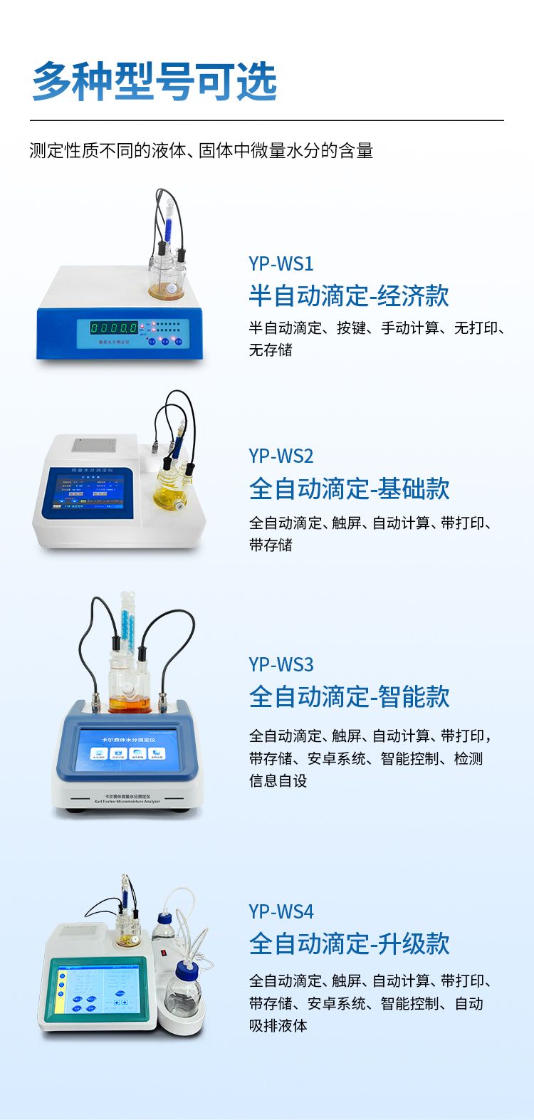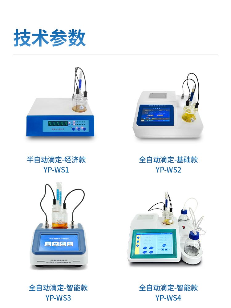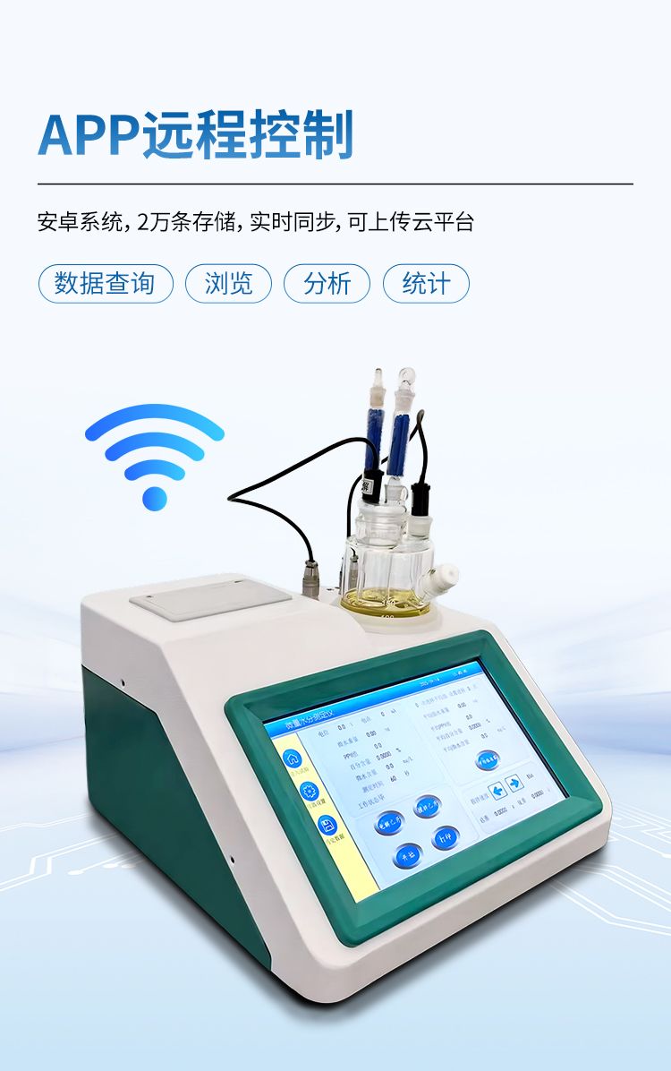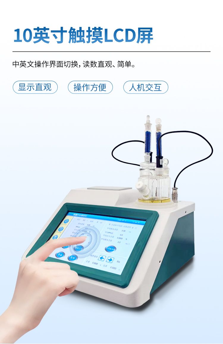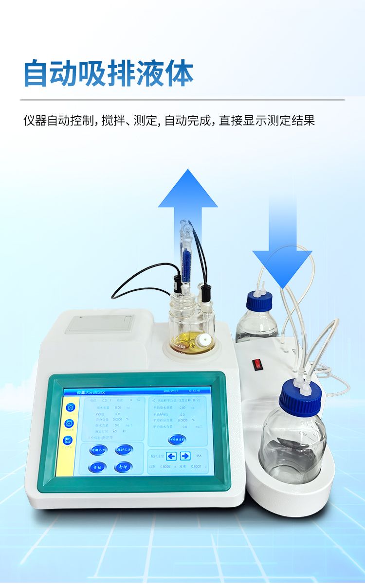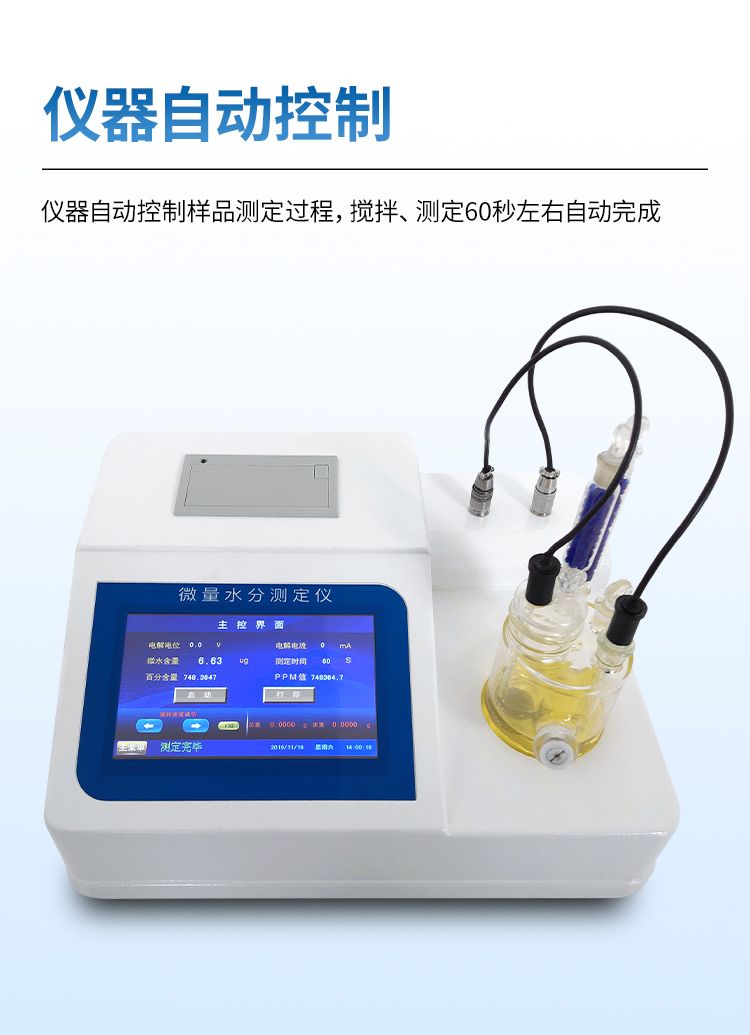 2.儀器具有試驗結果存儲、打印、計算功能;樣品測定過程由儀器自動控制,攪拌、測定60秒左右自動完成,直接顯示測定結果;全密封滴定池瓶,避免試劑與人接觸,也避免環境濕度的影響;并具有自動計算平均值和歷史記錄打印功能,能打印出百分含量、樣品編號、試驗員、實驗日期等內容;儀器準確度為:①水含量小于10微克水時,測量值誤差小于2ug水;②水含量在10微克-1000微克水時,測量誤差≤2ug水;③水含量在1000微克以上時,測量值誤差≤0.2%(不含進樣誤差);