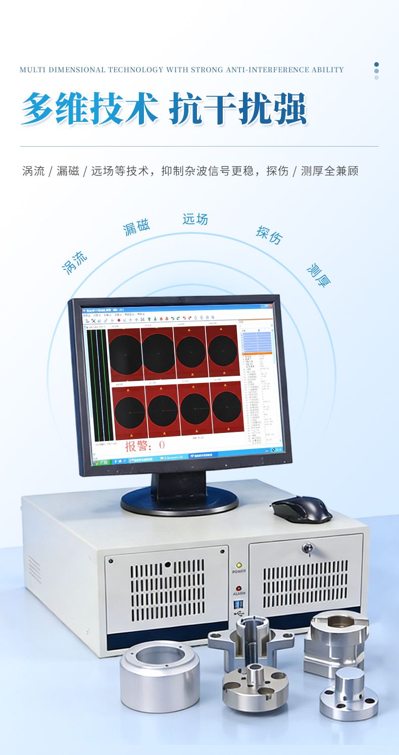 具有相對獨立的檢測通道,可同時驅動兩款不同形式的檢測探頭(由絕對和差動線圈構成的組合式探頭等),兩個檢測通道同時進行數據采集,用于檢出金屬管、棒生產中出現的縱向和橫向裂紋缺陷。用于焊管在線、離線檢測時,儀器對金屬管、棒、線材的裂紋、暗縫、氣孔、夾雜和開口裂紋等缺陷具有很高的檢測靈敏度。對生產過程中,因焊機故障而造成產品的緩變傷、長道傷均能可靠檢出。