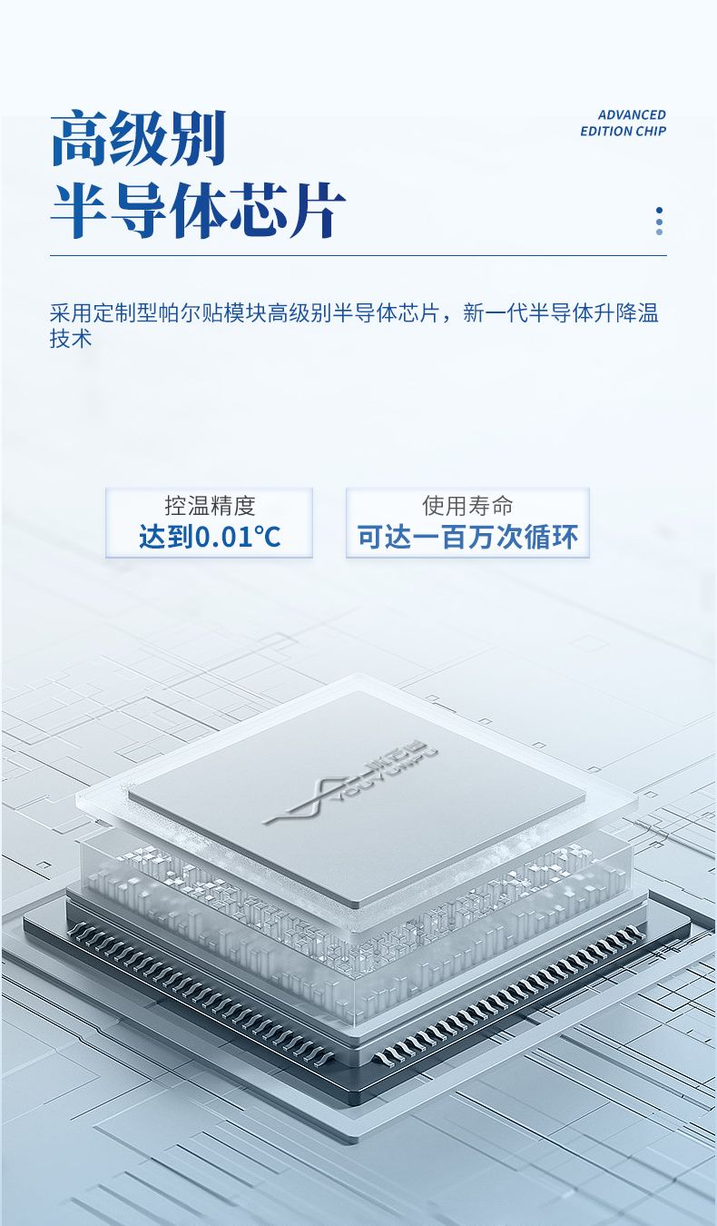 2、采用美國MARLOW定制型帕爾貼模塊高級別半導(dǎo)體芯片,新一代半導(dǎo)體升降溫技術(shù),最快變溫速率可達(dá)每秒7度,使用壽命可達(dá)一百萬次循環(huán);