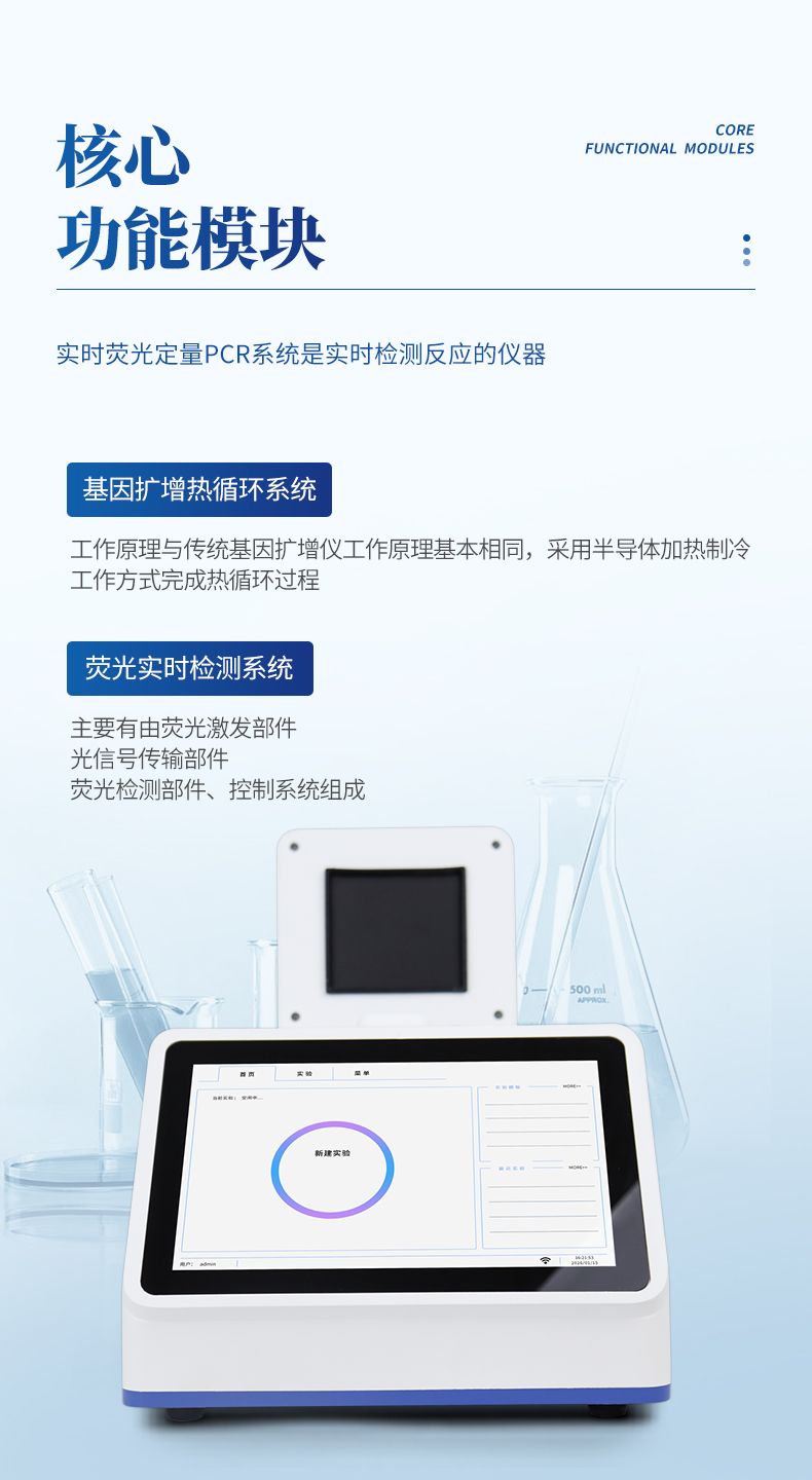 實時熒光定量PCR系統(tǒng)是實時檢測反應(yīng)的儀器,主要由基因擴增熱循環(huán)系統(tǒng)、熒光實時檢測系統(tǒng)、微電路控制系統(tǒng)、計算機及應(yīng)用軟件組成。其中兩個核心功能模塊:熱循環(huán)系統(tǒng)和熒光實時檢測系統(tǒng)。其中基因擴增熱循環(huán)系統(tǒng)工作原理與傳統(tǒng)基因擴增儀工作原理基本相同,采用半導(dǎo)體加熱制冷工作方式完成熱循環(huán)過程。熒光檢測系統(tǒng)主要有由熒光激發(fā)部件、光信號傳輸部件、熒光檢測部件、控制系統(tǒng)組成。