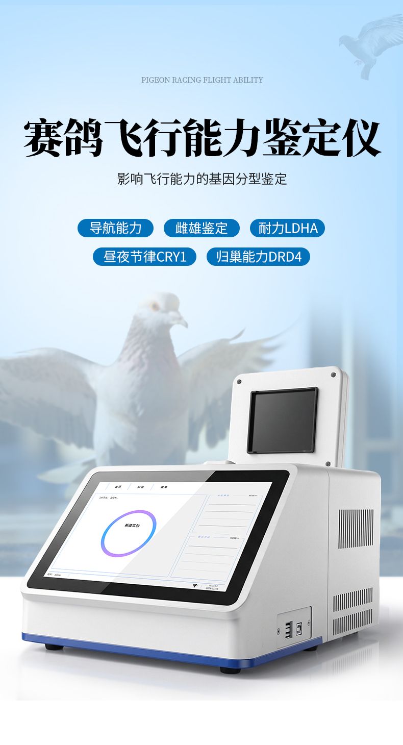 我司結(jié)合上述基因研究推出的鴿子飛行能力鑒定儀可同時鑒定包含鴿子雌雄性別及歸巢能力DRD4、飛行耐力LDHA、導(dǎo)航能力、晝夜節(jié)律CRY1、肌力(肌肉調(diào)控)MSTN、羽翼(羽毛結(jié)構(gòu)和強度)F-KER、智力CASK和陰雨天定向GSR等影響飛行能力的基因分型鑒定。