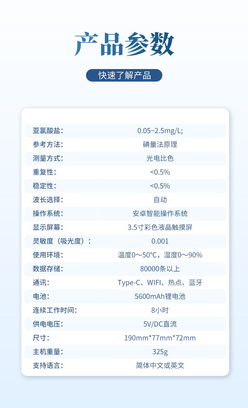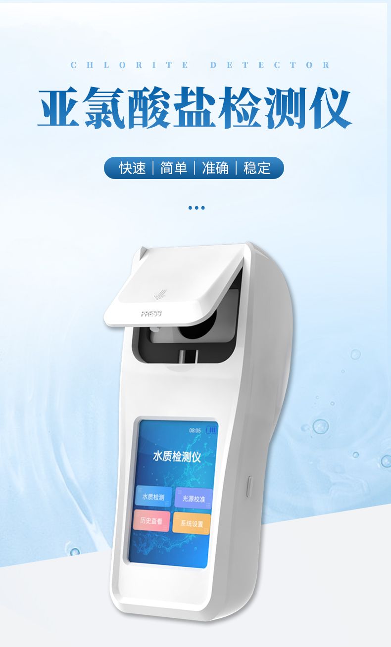 亞氯酸鹽是投放二氧化氯消毒劑后的副產(chǎn)物,超標(biāo)對人有致癌作用。便攜式亞氯酸鹽檢測儀器配合快速顯色檢測試劑,可“快速、簡單、準(zhǔn)確、穩(wěn)定”進行測量,擁有精美的外觀造型,簡單的操作界面,準(zhǔn)確的檢測系統(tǒng),幫助用戶獲得精細的數(shù)據(jù),可更準(zhǔn)確、有效的分析水體狀況。