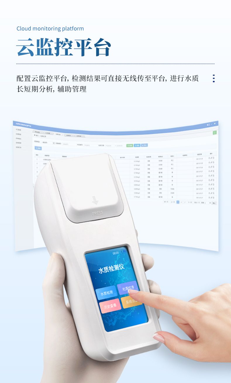 ②配置云監(jiān)控平臺,檢測結(jié)果可直接無線傳至平臺,進行水質(zhì)長短期分析,輔助管理。