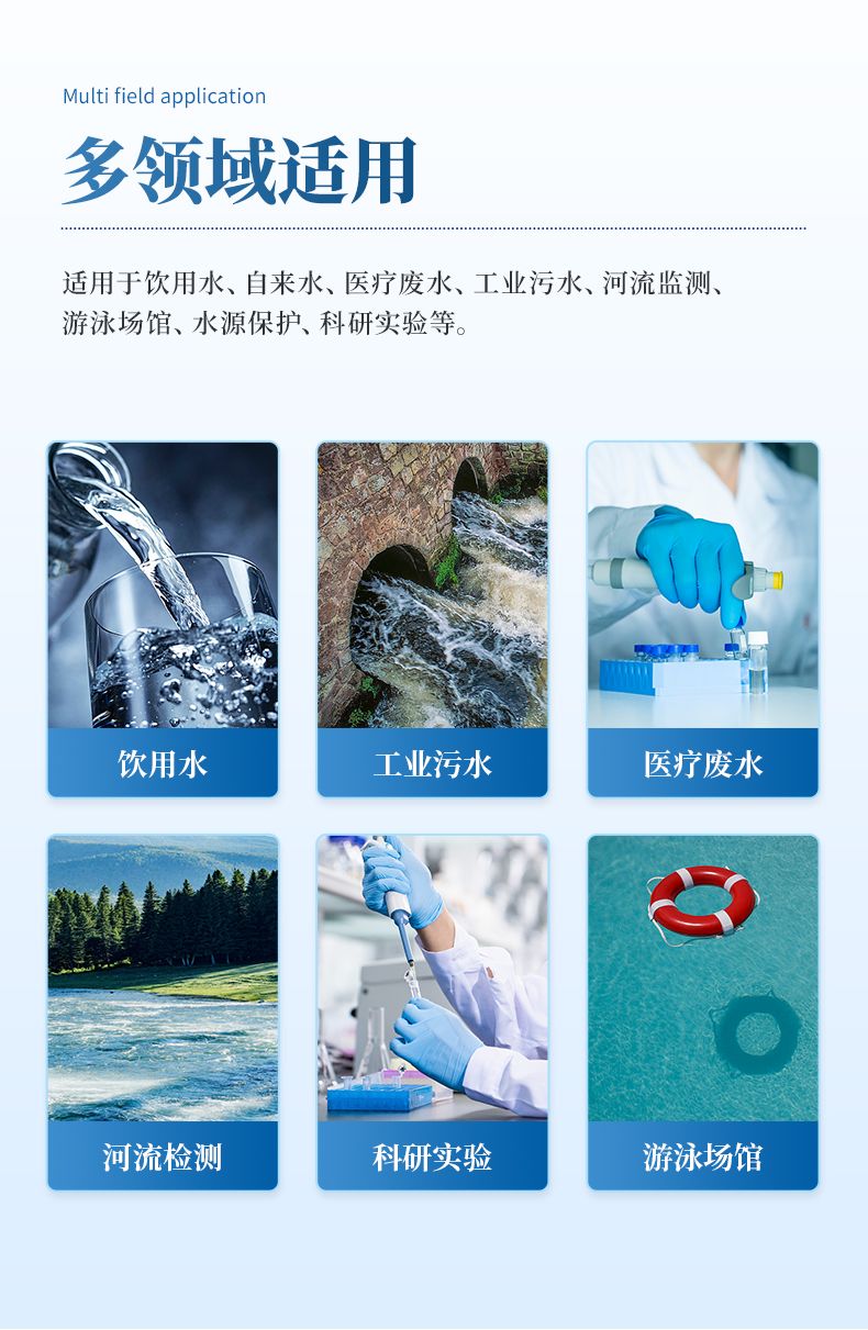 適用于飲用水、自來水、醫(yī)療廢水、工業(yè)污水、河流監(jiān)測、游泳場館、水源保護、科研實驗等。