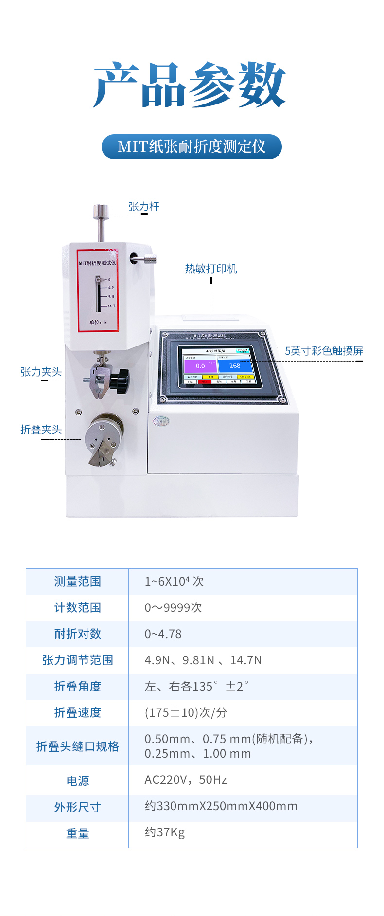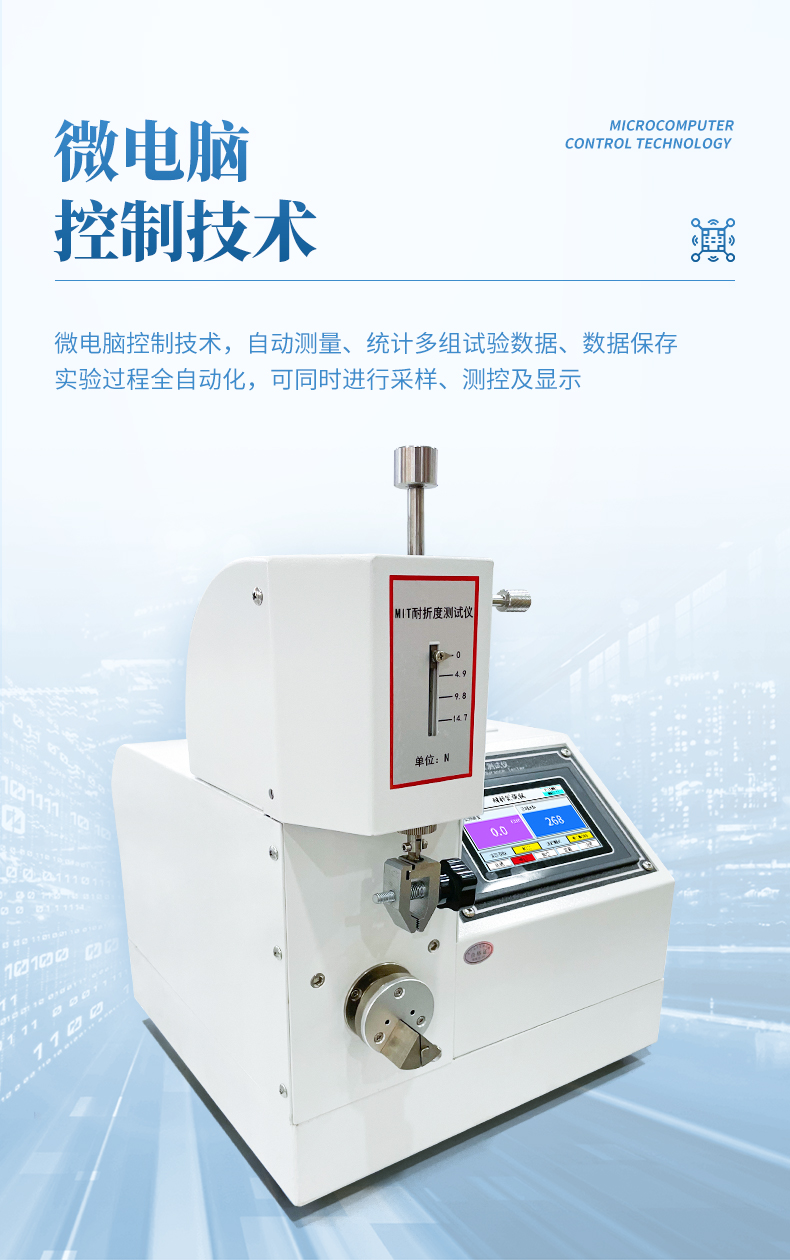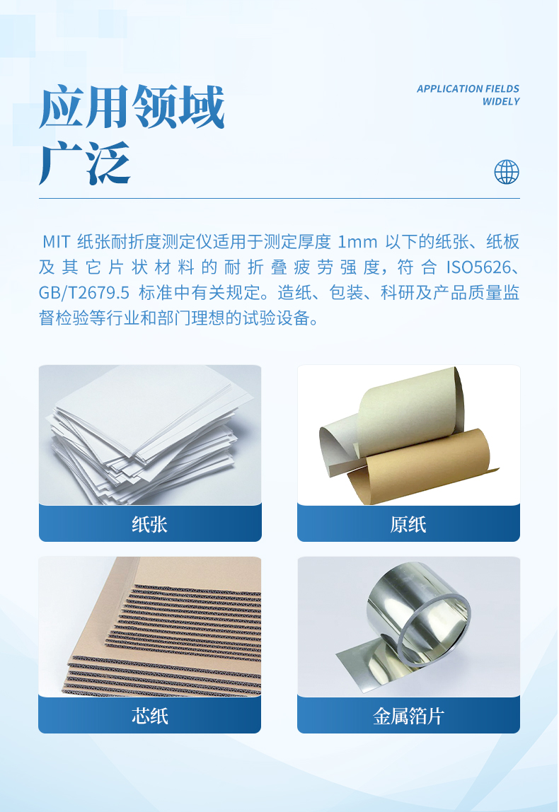 MIT紙張耐折度測定儀適用于測定厚度1mm以下的紙張、紙板及其它片狀材料的耐折疊疲勞強度,符合ISO5626、GB/T2679.5標準中有關規(guī)定。造紙、包裝、科研及產(chǎn)品質(zhì)量監(jiān)督檢驗等行業(yè)和部門理想的試驗設備。